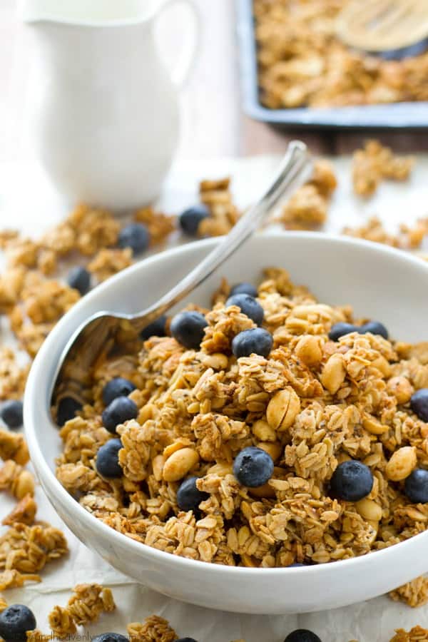 You won’t believe that this loaded peanut butter granola is good for you! It’s so crunchy, peanut butter-y and addicting, you’ll want to eat it all straight from the pan!